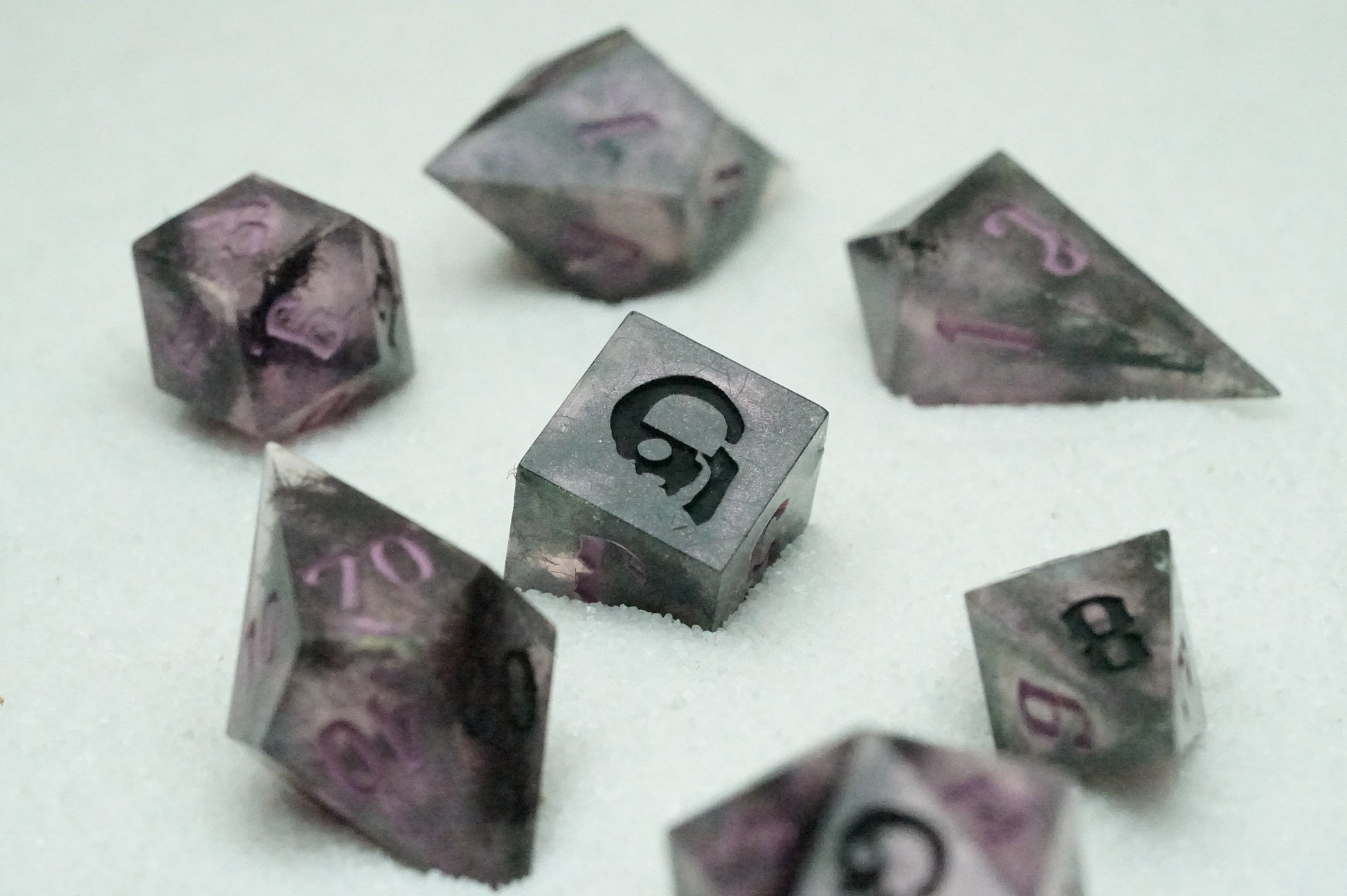 These dice whisper softly... and then scream. A quiet gloom clings to every edge. Great for the rogue who never speaks or the bard who sings exclusively in minor keys.