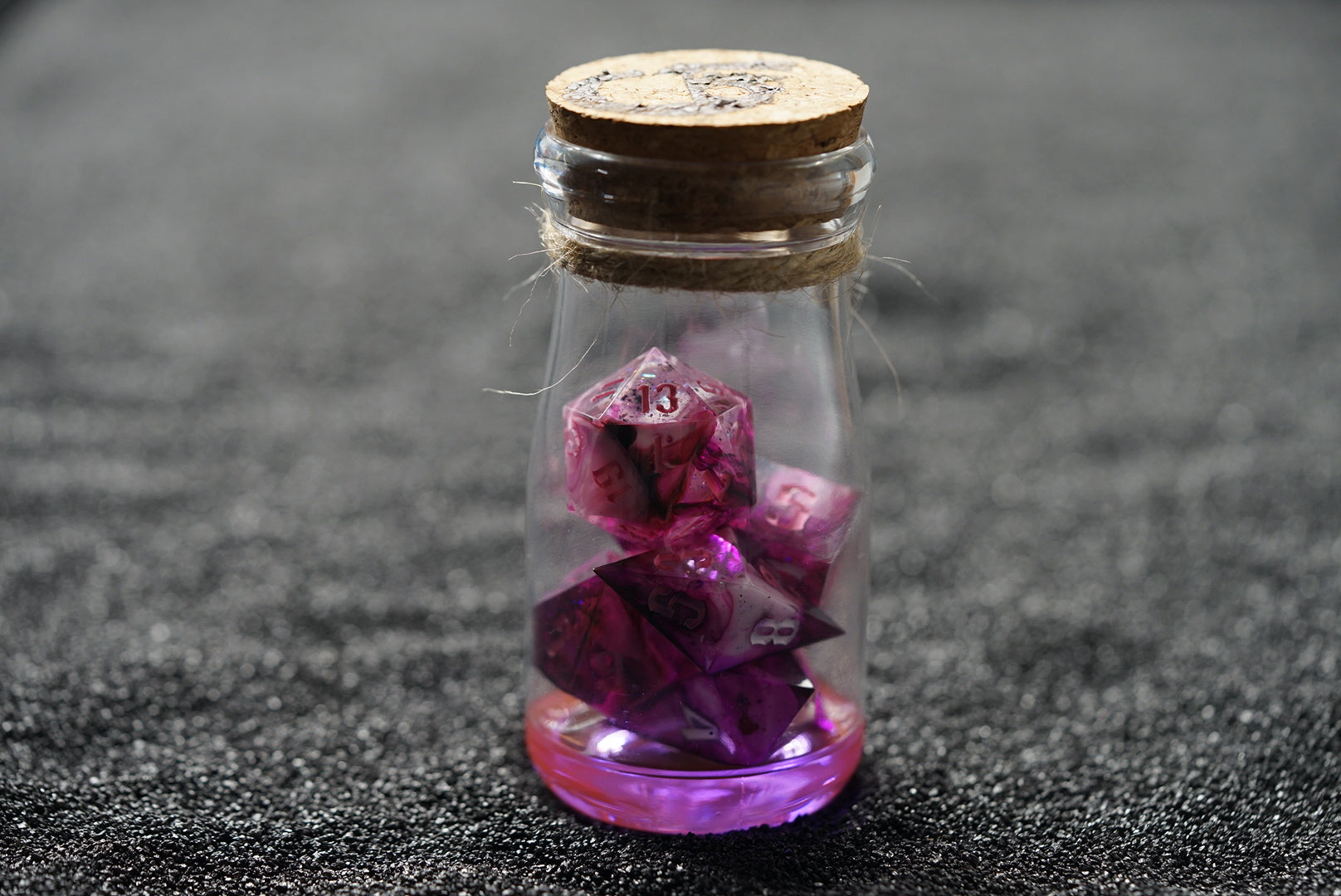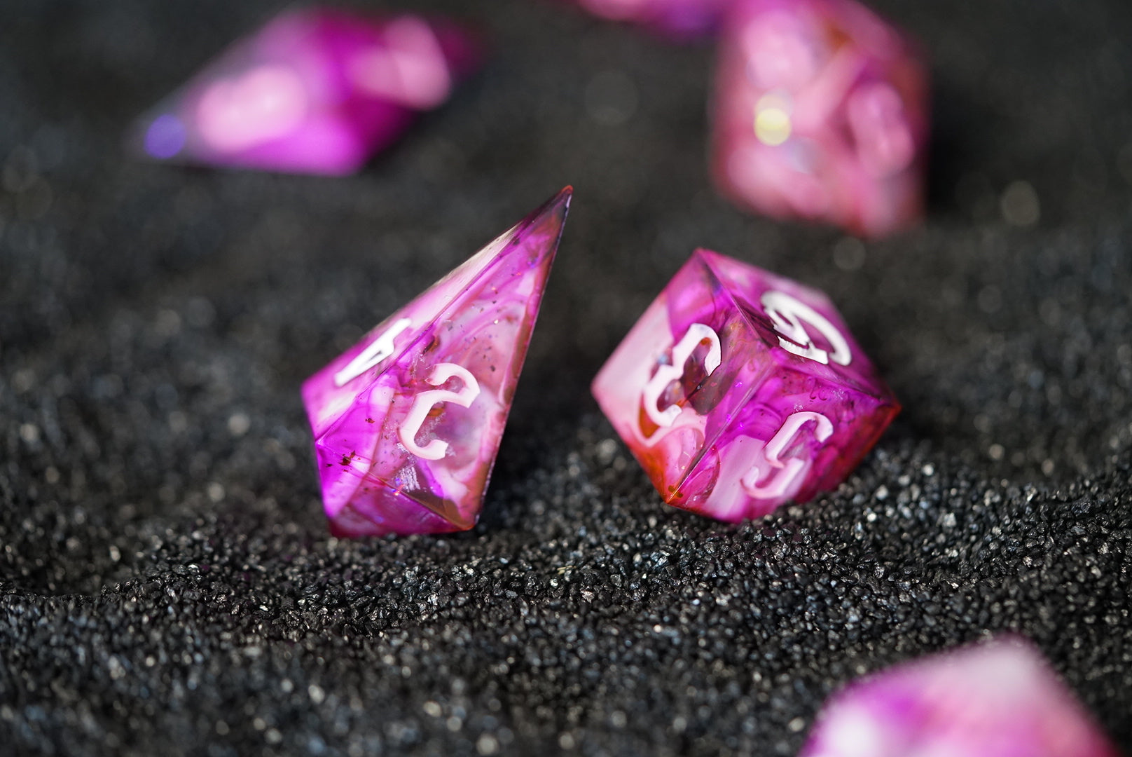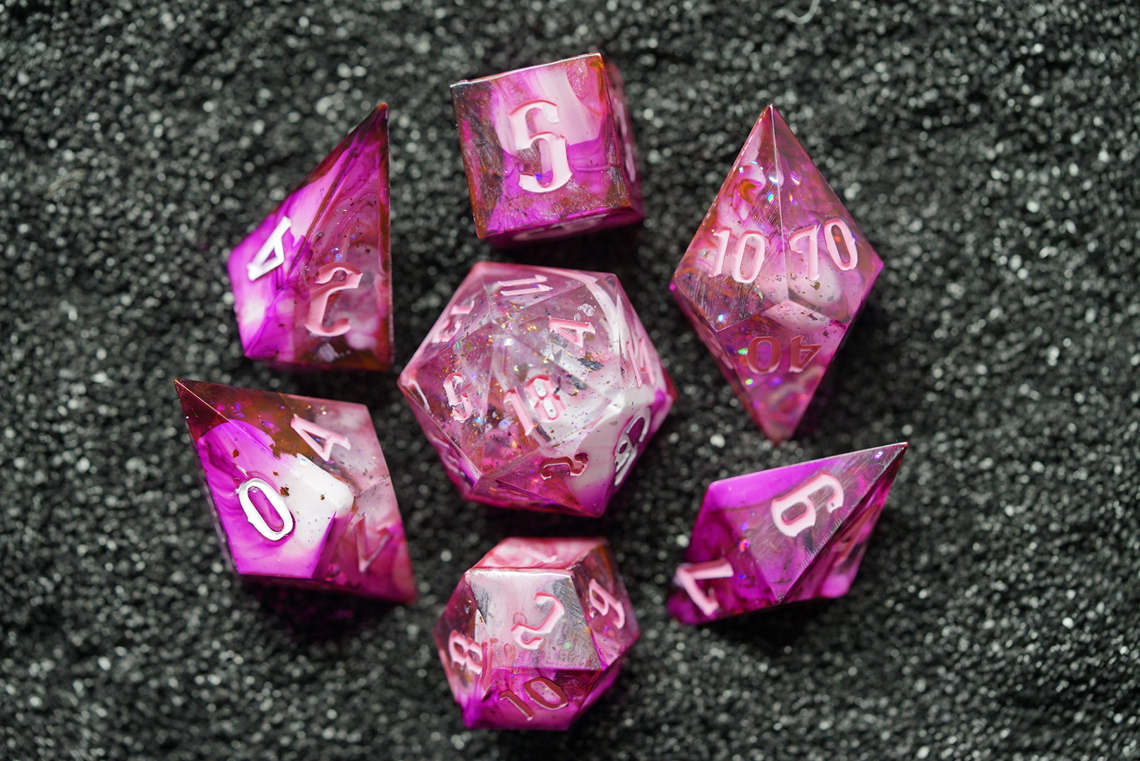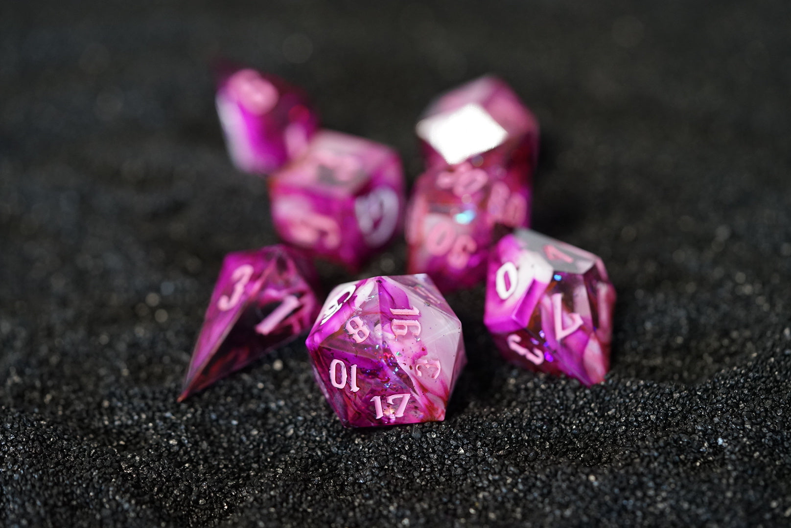 Delicate, deadly, and definitely judging your alignment. This set swirls like a cursed love letter and rolls like it came with emotional baggage. Ideal for clerics of heartbreak and bards with vendettas.
