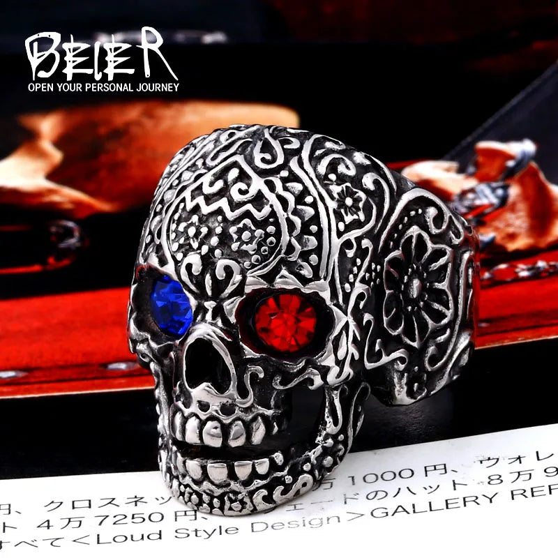 Anillo Beier de acero inoxidable 316L con diseño de calavera para hombre, con ojos rojos y azules, joyería de alta calidad, LLBR8-644R