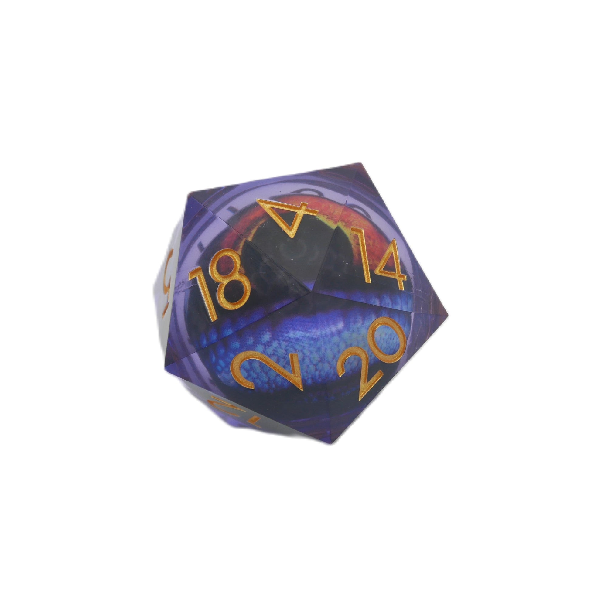 Transparent purple resin D20 with a floating, moving orange eyeball.