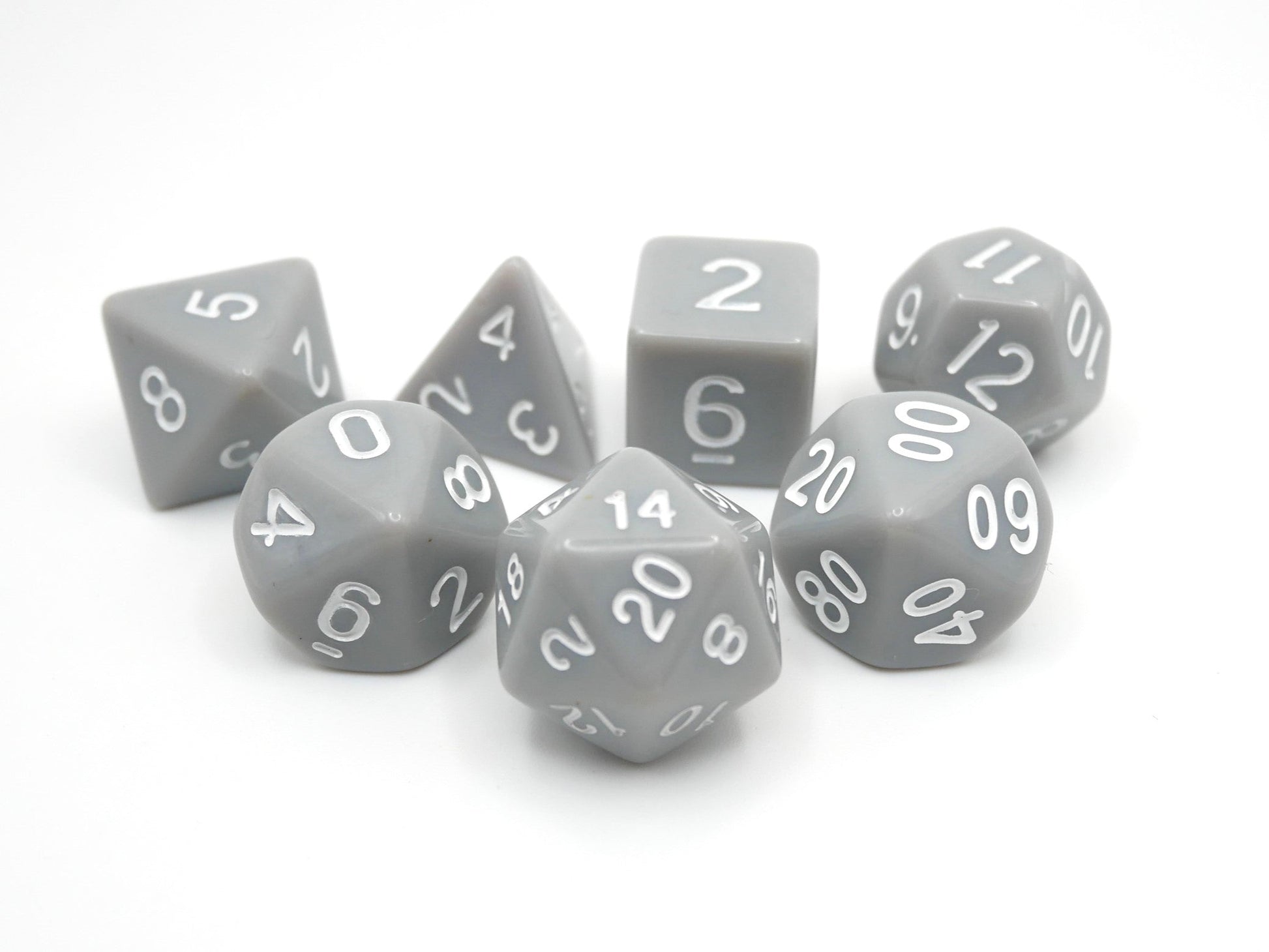 Opaque grey dice with white numbers.