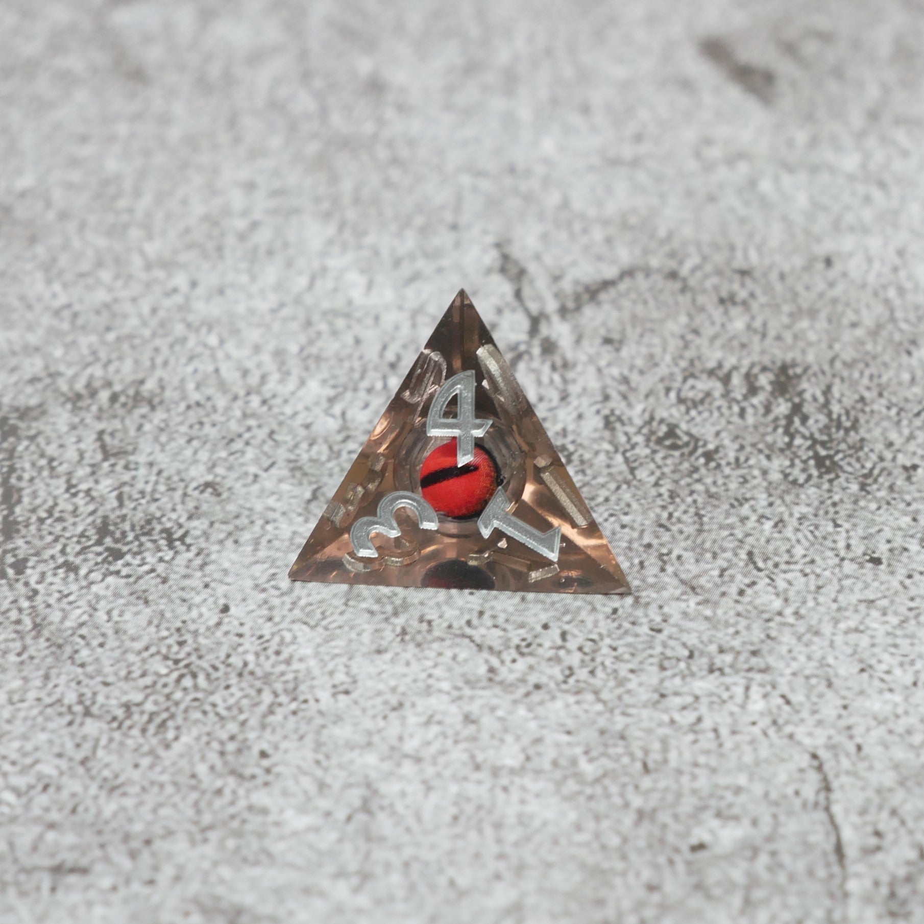 Clear gray, sharp edge dice with floating, moving orange eyeball.