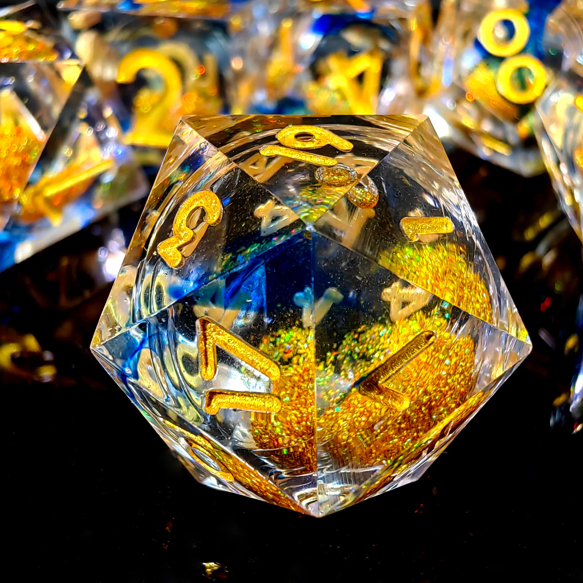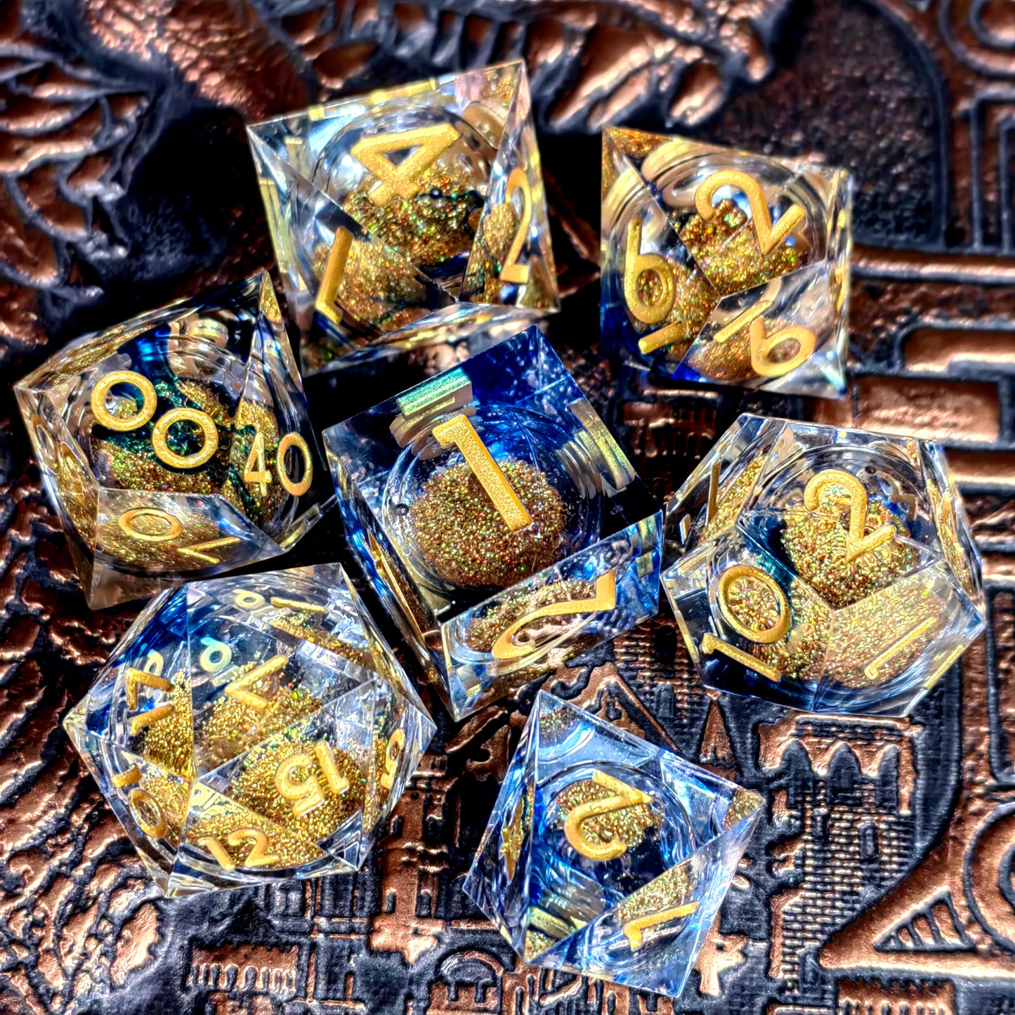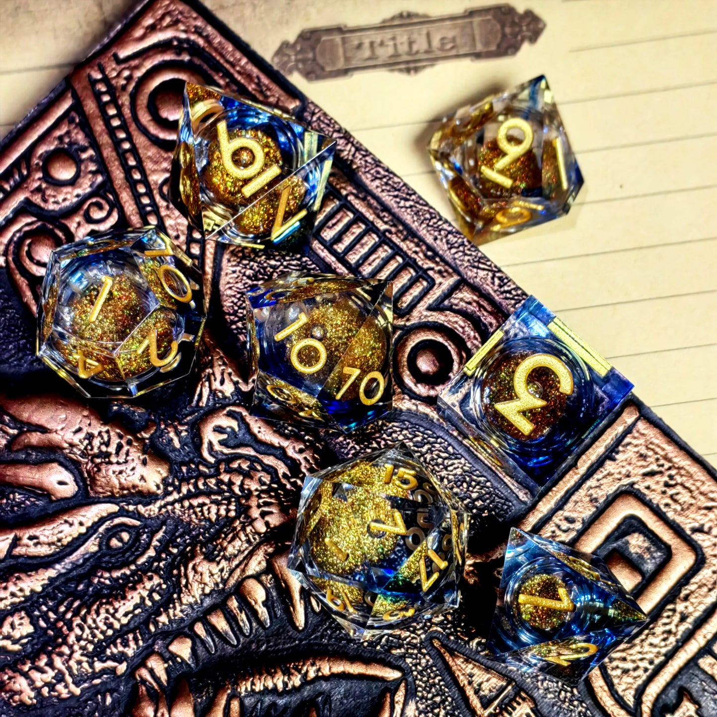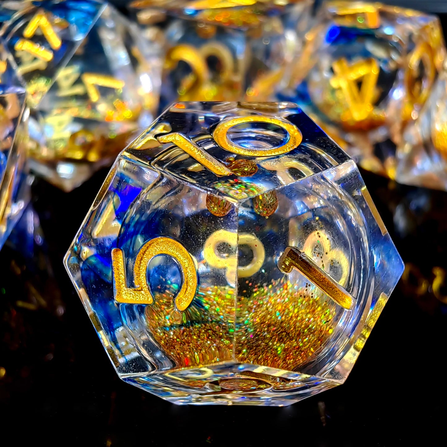 DnD Dice Set - 7 Piece Resin Dice with Golden Sand, Transparent Base Gold Lettering for RPG Games
