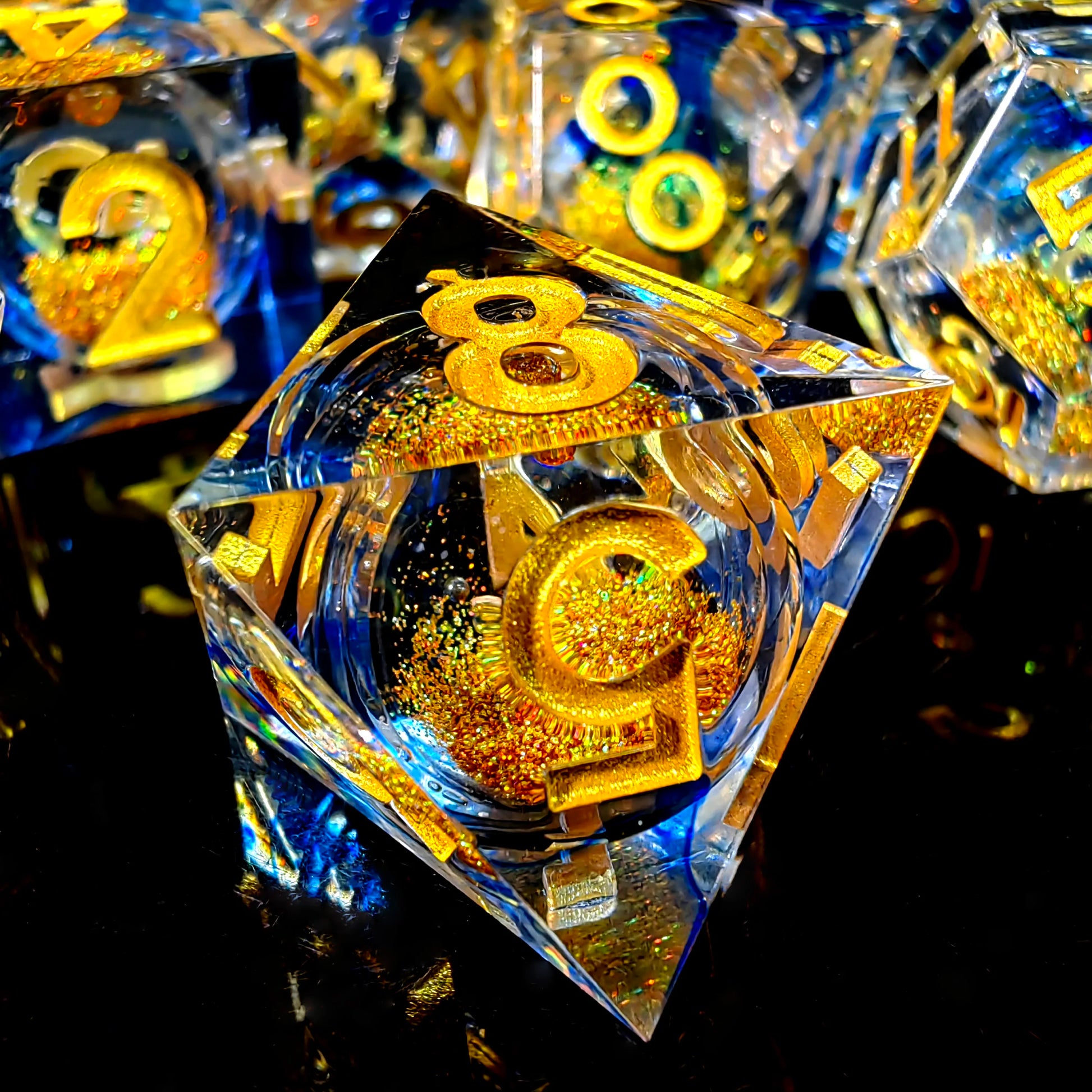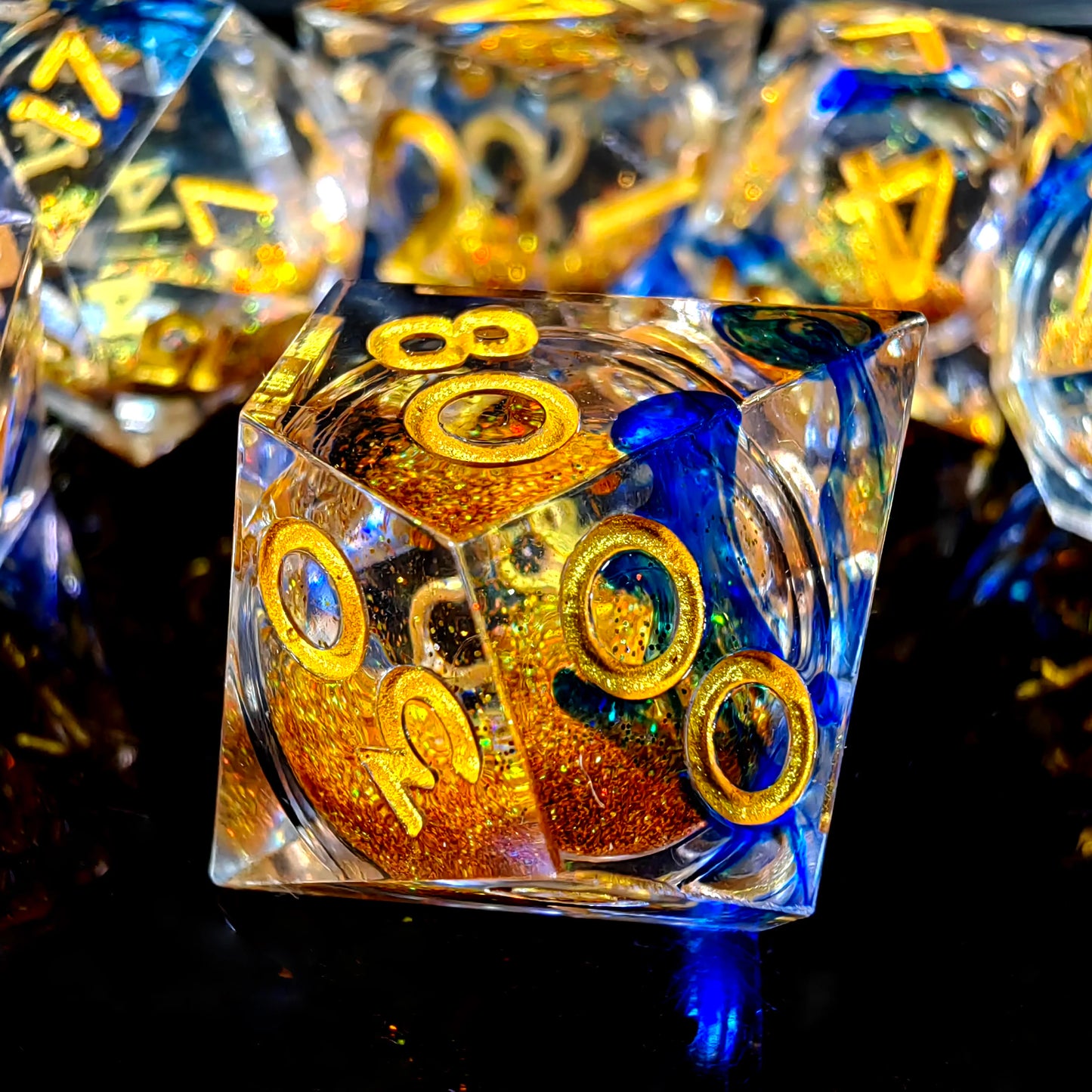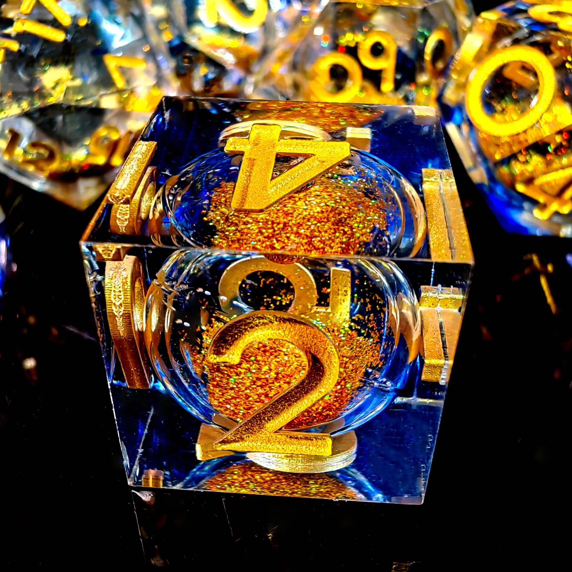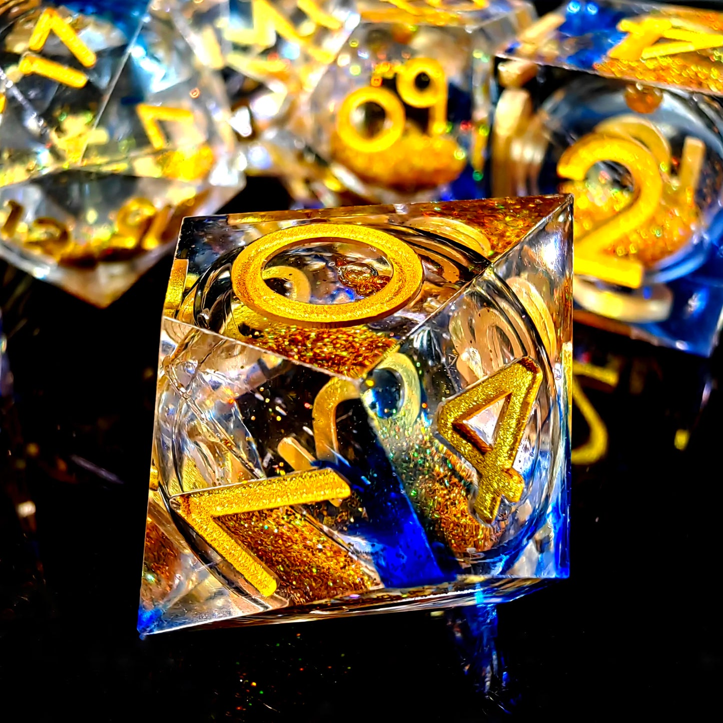 DnD Dice Set - 7 Piece Resin Dice with Golden Sand, Transparent Base Gold Lettering for RPG Games
