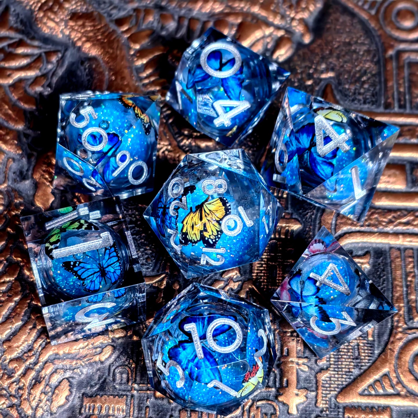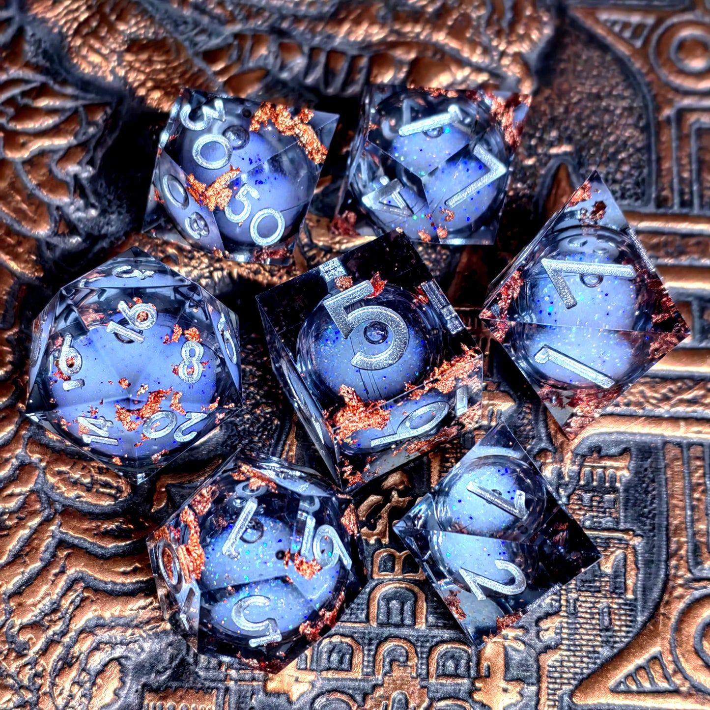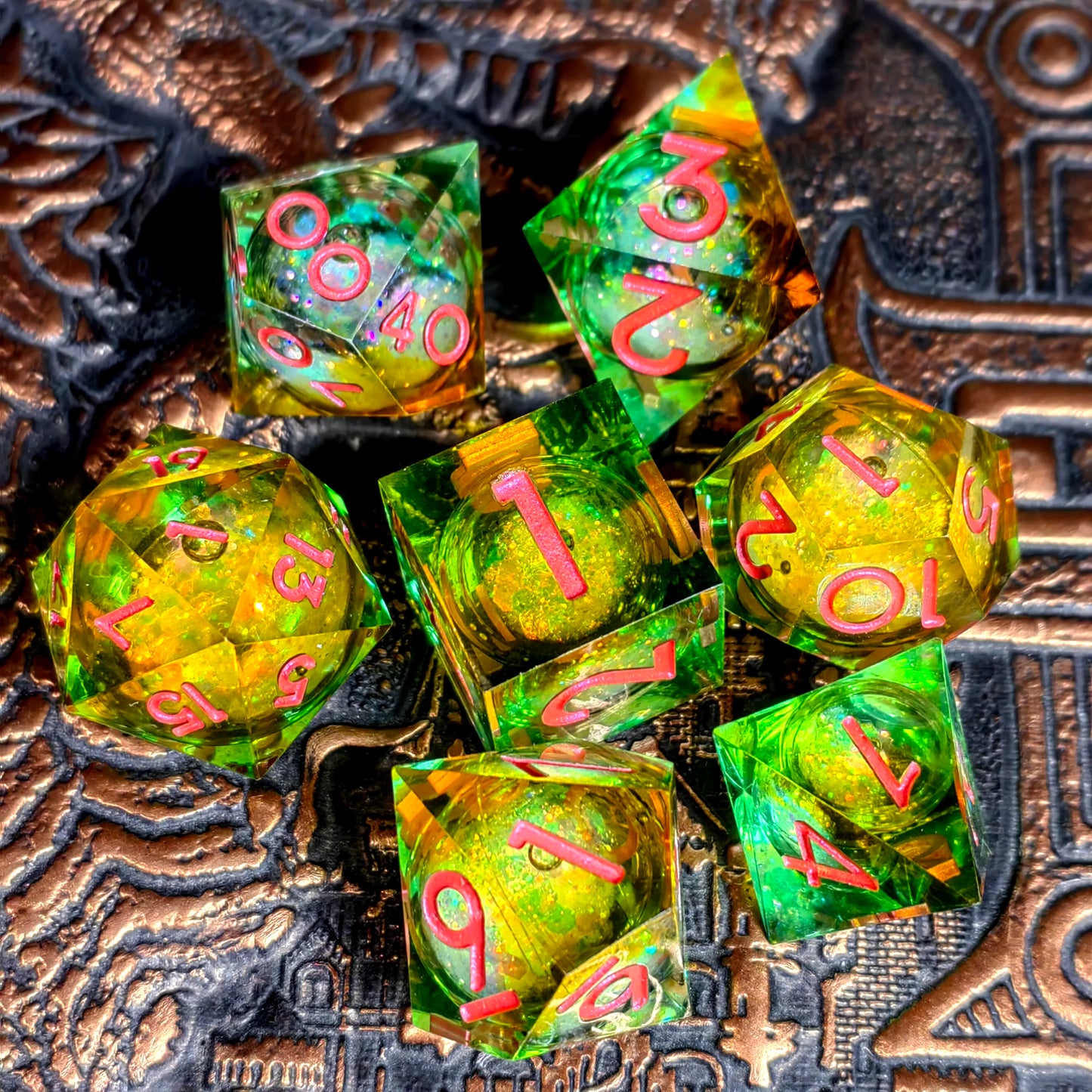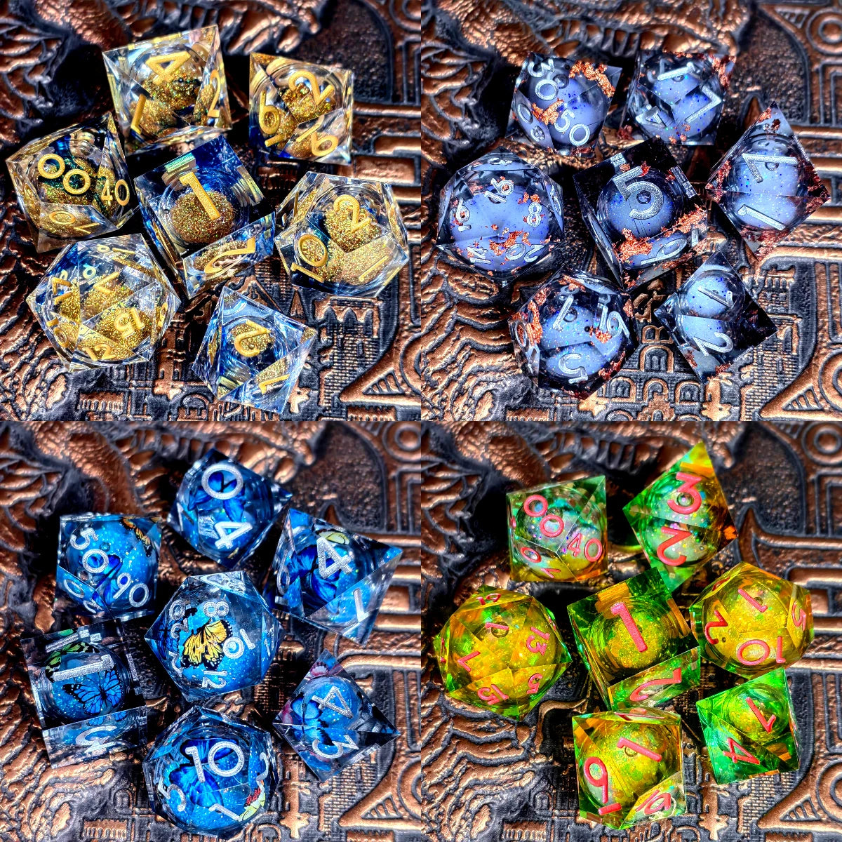 DnD Dice Set - 7 Piece Resin Dice with Golden Sand, Transparent Base Gold Lettering for RPG Games